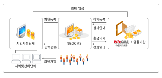 NGOCMS´Â ½Ã¹Î»çȸ´ÜüÀÇ ¿øÈ°ÇÑ È¸ºñ ¼ö³³°ú µ¿½Ã¿¡ »êÇÏÁ¶Á÷ ¹× ȸ¿ø°ü¸®, ¹®ÀÚ ¹× ¸ÞÀϸµ ¹ß¼Û, ±âºÎ±Ý¿µ¼öÁõ ¹ßÇà µî ½Ã¹Î»çȸ´Üü¿¡ ÇÊ¿äÇÑ ¼ºñ½º¸¦ Á¾ÇÕÀûÀ¸·Î Á¦°øÇÏ´Â ¿Â¶óÀÎ ¼ºñ½º ÀÔ´Ï´Ù.